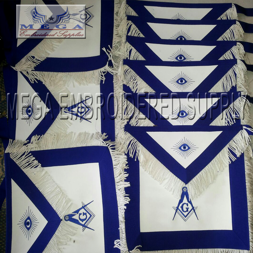 Machine made Embroidered Master Mason Apron size 14x16 center logo S/C white fringe border blue ribbon backing blue pocket belt and snake set enclosure