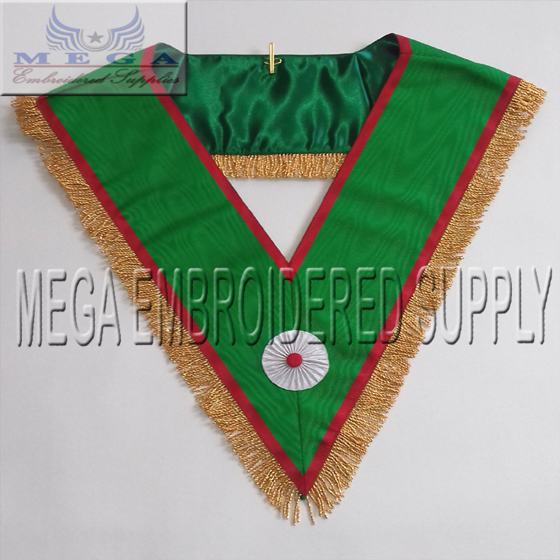 Green ribbon edged red line backing green white rosettes Gold Mylar fringe