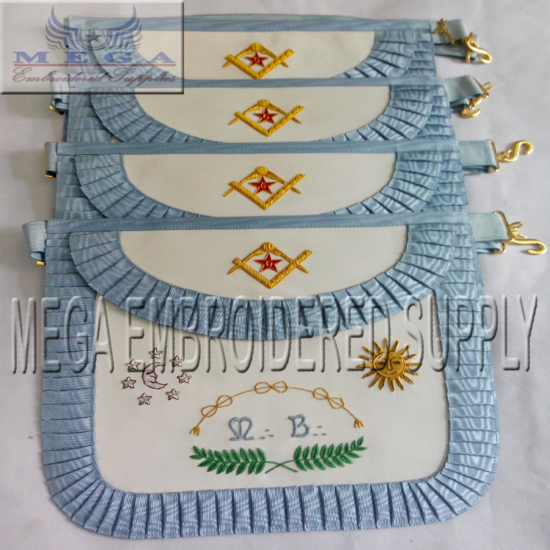 Apron size 32x38 Leaves, MB Square & compass all design are handmade Embroidered border Pale Light Blue backing Black with pocket for gloves belt and snake set ( Background Imitation leather )