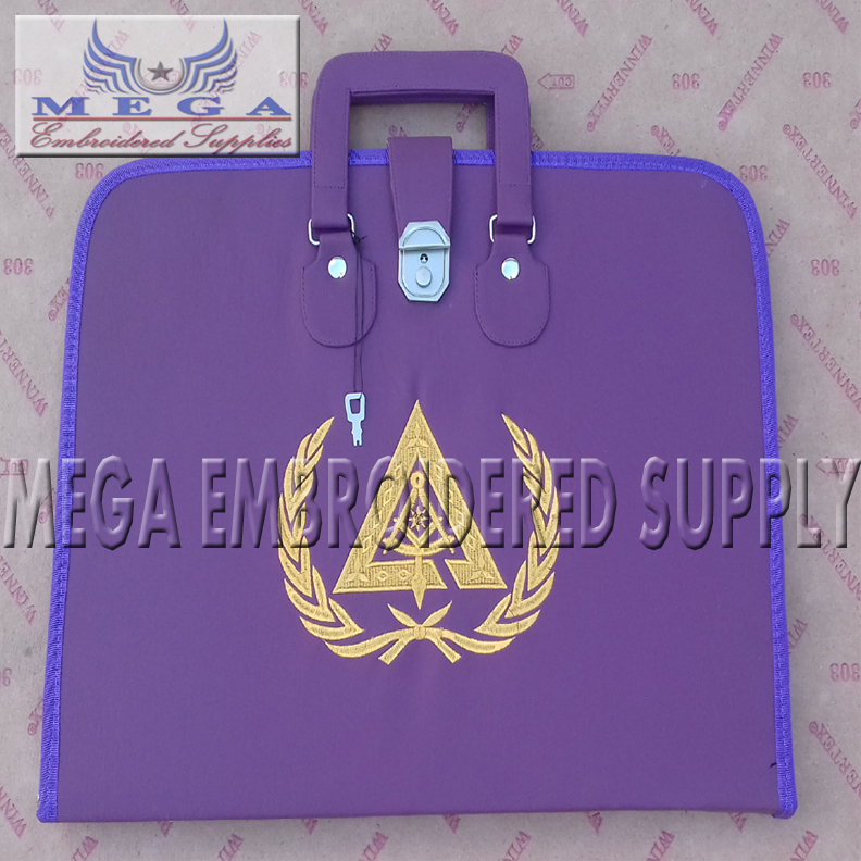 Apron case is made of Imitation leather inside apron fitting pocket for gloves jewel carrying handle zip system all around the head any type of Lodge Logo, Emblem or ranks can be made Machine and handmade embroidered ( customized one also for chain collar and apron )