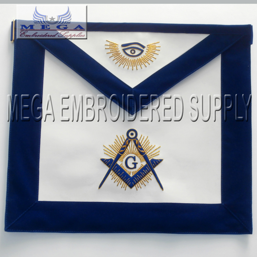 Handmade Embroidered Master Mason Apron size 14x16 center logo S/C with GOLD rays border blue ribbon backing blue pocket belt and snake set enclosure