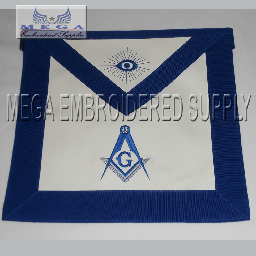 Machine made Embroidered Master Mason Apron size 14x16 center logo S/C with G border blue ribbon backing blue pocket belt and snake set enclosure