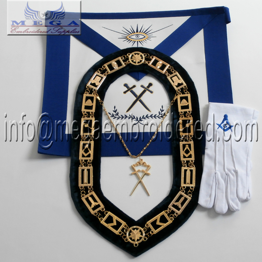 machine made embroidered officer ranks set of 15 apron size 14x16 Gold & blue threads used for embroidery blue ribbon border backing blue with pocket belt and snake set