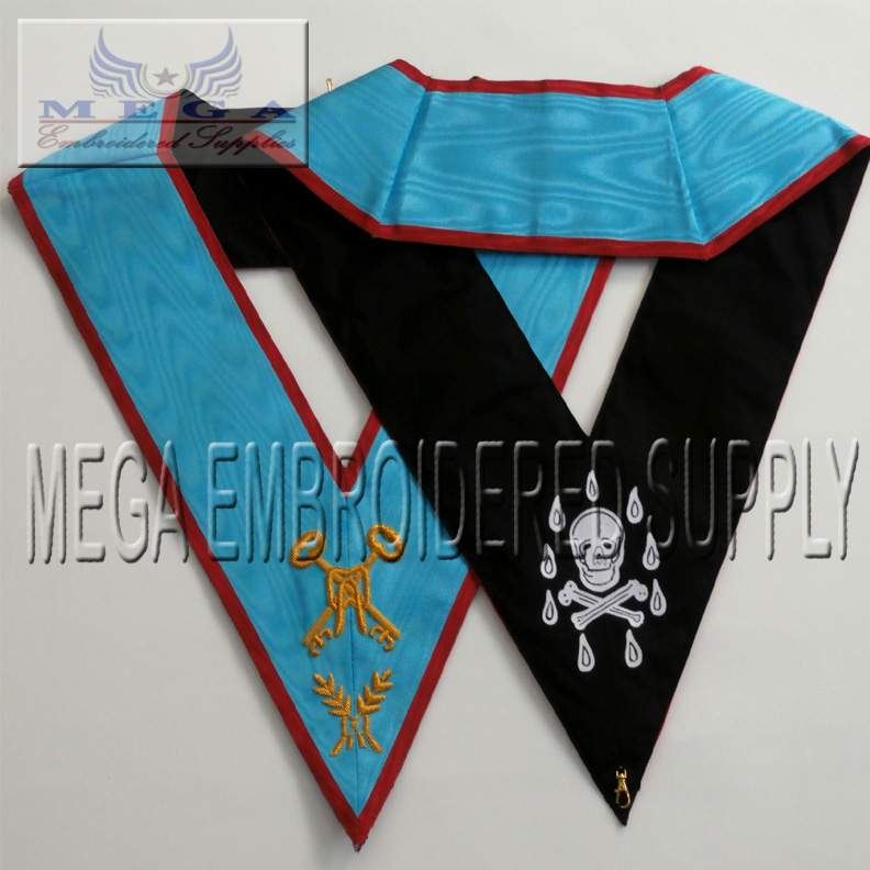 handmade Embroidered with Bullion wire threads on Blue ribbon border red backing black with Skull & tear printing with Metal Fastening hooks