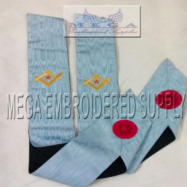 machine Embroidered on light Blue ribbon backing Black with Skull & tear printing and metal fastening hooks